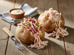 Pieczone ziemniaki nadziewane indykiem i surówką z kapusty (kumpir)