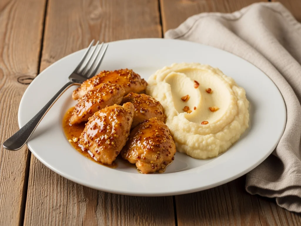 Miodowo-musztardowy kurczak z czosnkowym purée z kalafiora