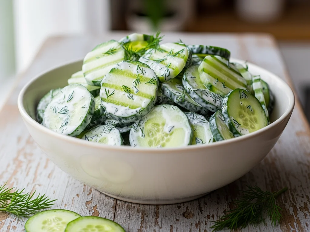 1. Włożyć trzpień i pojemnik nakładki krojącej. Umieścić tarczę tnącą stroną 1 (do krojenia) skierowaną do góry. Nałożyć pokrywę nakładki krojącej. Do szerokiej części podajnika włożyć ogórki. Używając popychacza, uruchomić Krojenie /Cienko. Pokrojone ogórki przełożyć do salaterki. Do salaterki dodać śmietanę, koperek i cukier, wymieszać. Przyprawić solą i pieprzem. Mizerię z cienko krojonych ogórków podawać jako dodatek do dań głównych.