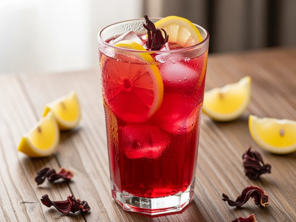 - Dodać cukier puder, lód i sok z cytryny, wymieszać10 s/obr. 5. Przelać do 8 szklanek. Mrożoną herbatę cytrynowo-hibiskusową podawać z dodatkiem kostek lodu, udekorowaną plastrami cytryny i liśćmi mięty.