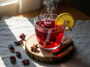 - Dodać cukier puder, lód i sok z cytryny, wymieszać10 s/obr. 5. Przelać do 8 szklanek. Mrożoną herbatę cytrynowo-hibiskusową podawać z dodatkiem kostek lodu, udekorowaną plastrami cytryny i liśćmi mięty.