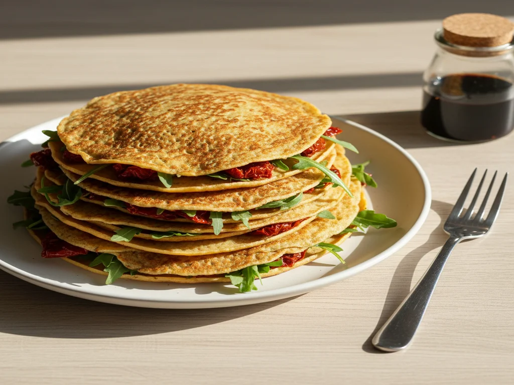 Naleśniki z ciecierzycy z farszem z suszonych pomidorów i rukolą