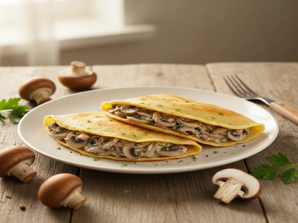 - Na każdy naleśnik nałożyć po ok. 2 łyżki nadzienia z pieczarkami i śmietanką sojową, rozsmarować po całej powierzchni, następnie dowolnie zawinąć lub składać w trójkąty. Udekorować rukolą lub świeżymi ziołami (szczypiorkiem, bazylią). Naleśniki z pieczarkami i śmietanką sojową podawać bezpośrednio po przygotowaniu.
