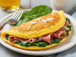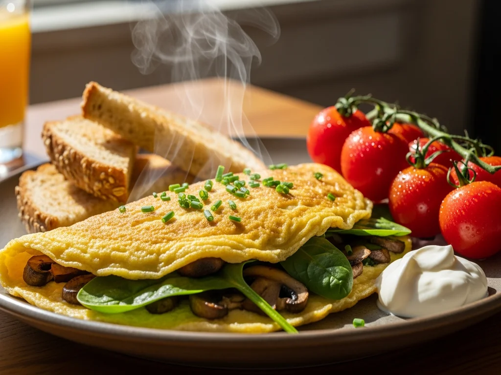 - Za pomocą papieru do pieczenia ostrożnie przełożyć omlet na talerz i równomiernie posmarować go serkiem śmietankowym. Docisnąć szpinak za pomocą kopystki, aby pozbyć się nadmiaru płynu, rozłożyć na omlecie. Oprószyć solą, pieprzem cayenne i pieprzem czarnym, rozłożyć ½ zrumienionych pieczarek i kukurydzę. Omlet zawinąć, przekroić na pół. Omlet na parze z pieczarkami i szpinakiem podawać udekorowany pozostałymi zrumienionymi pieczarkami (patrz wskazówka).