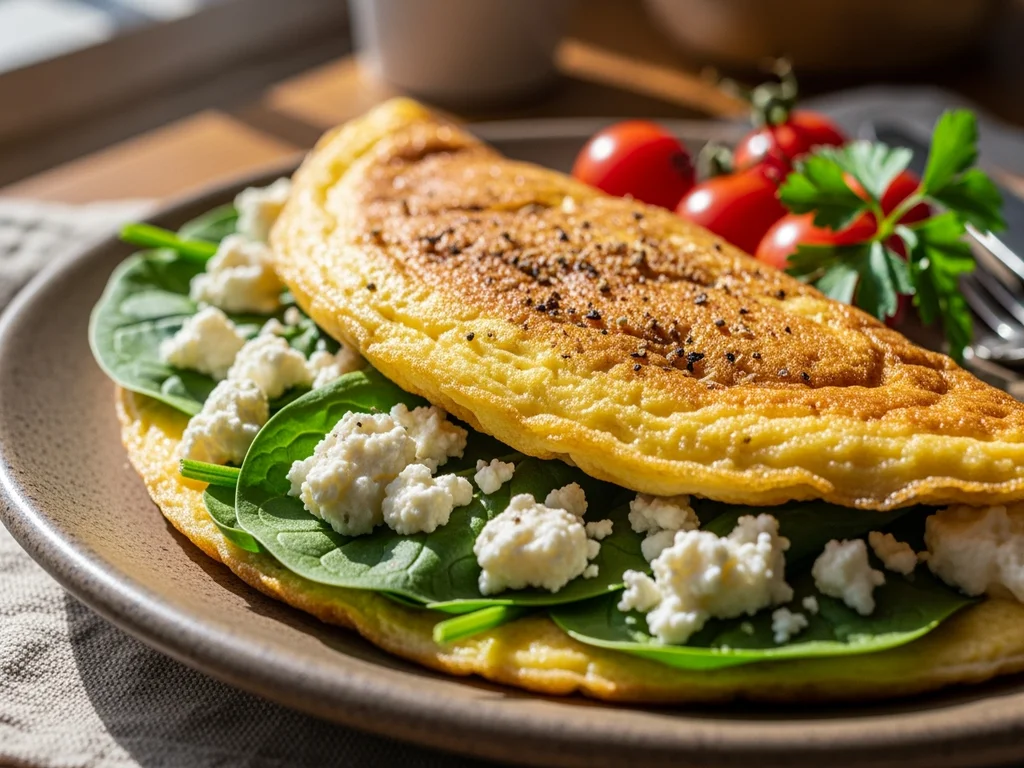 - Do naczynia miksującego wbić jajka, dodać sól i pieprz, wymieszać10 s/obr. 4. Na kuchence na nieprzywierającej patelni rozgrzać niewielką ilość oleju, wlać masę jajeczną. Smażyć z dwóch stron 2-3 min. Przełożyć na talerz. Na połowie omletu rozłożyć odważony szpinak, omlet delikatnie złożyć na pół za pomocą łopatki. Posypać odważoną fetą, obok ułożyć pomidorki. Omlet z fetą i szpinakiem podawać udekorowany bazylią.
