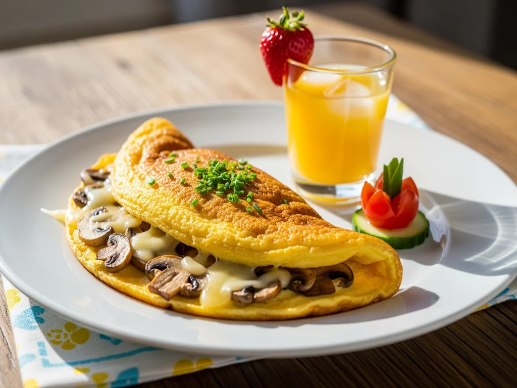 - Omlet z pieczarkami podawać pokrojony na kawałki, z dodatkiem brokułów, kalafiora i szynki.