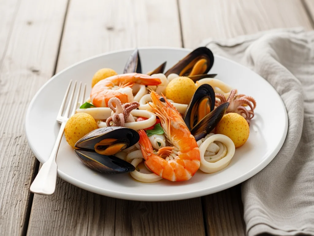Operetta z owocami morza i kulkami ziemniaczanymi