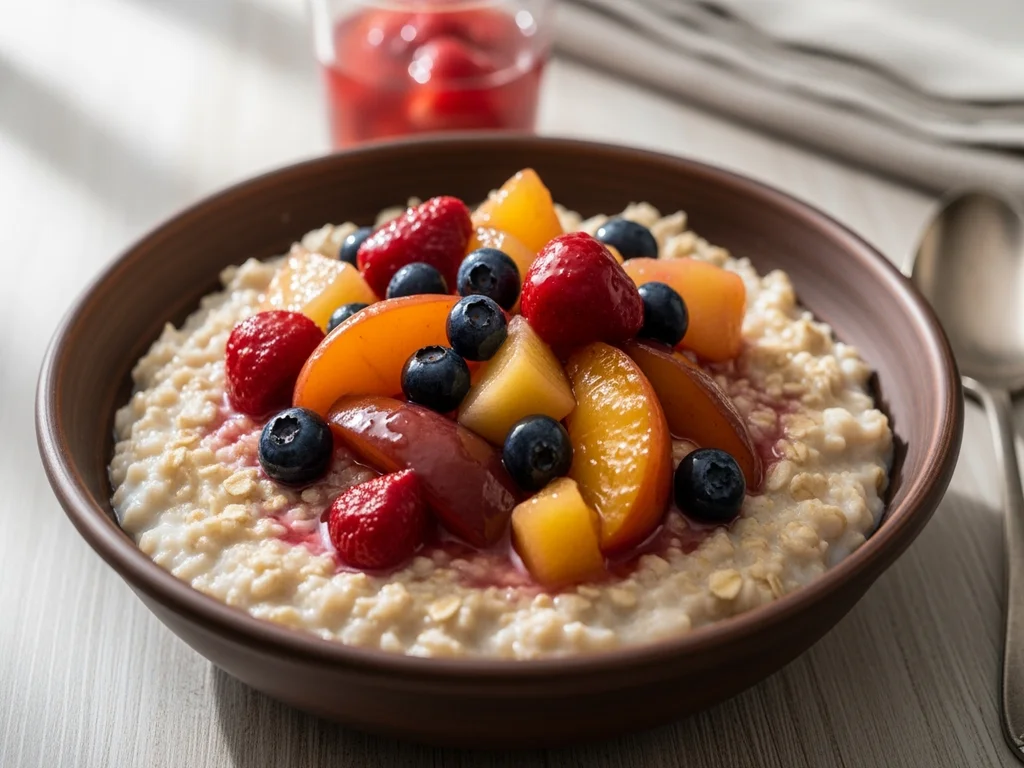 - Do naczynia miksującego wlać mleko, dodać owoce, płatki owsiane i cukier, podgrzewać10 min/90°C//obr. . Owsiankę w razie potrzeby pozostawić na kilka minut w naczyniu miksującym, aby zgęstniała. Owsiankę z owocami z kompotu podawać z dodatkiem świeżych owoców lub orzechów.
