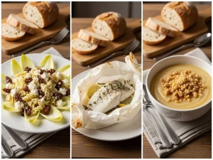 Pasta z daktyli i koziego sera na cykorii; Ryba w papilotach; Krem jabłkowy z kruszonką