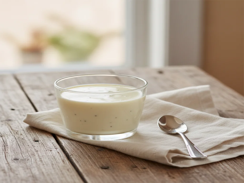 - Do naczynia miksującego włożyć ziarna i rozciętą laskę wanilii, dodać mleko, śmietanę, żelatynę i cukier, podgrzewać10 min/90°C/obr. 2. Laskę wanilii ostrożnie usunąć.