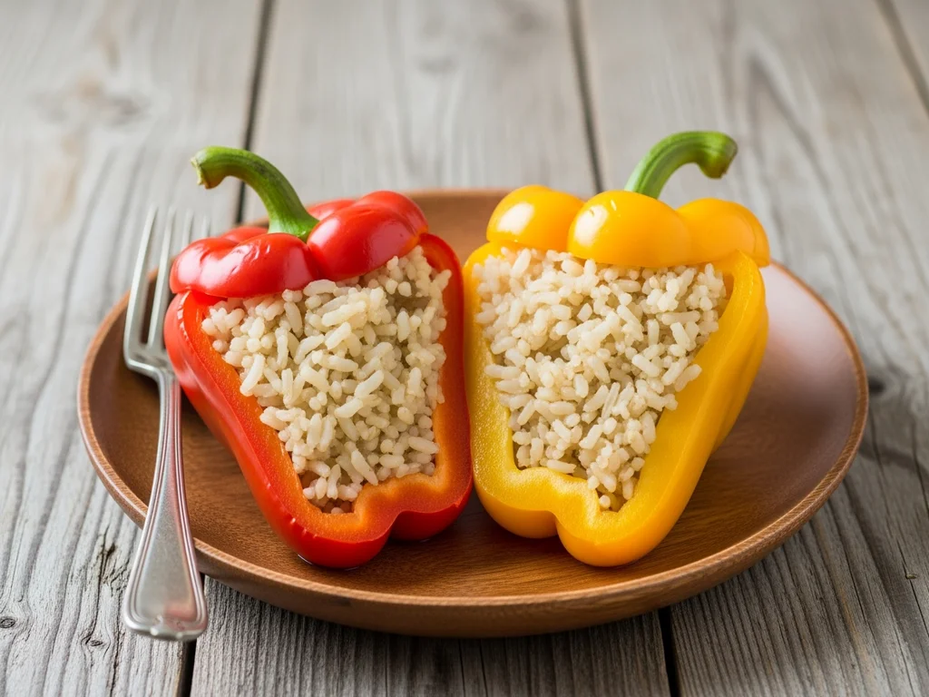 - Dodać ryż, dusić bez założonej miarki5 min/120°C//obr. 1. Paprykom odciąć górne części, usunąć gniazda nasienne, odstawić.
