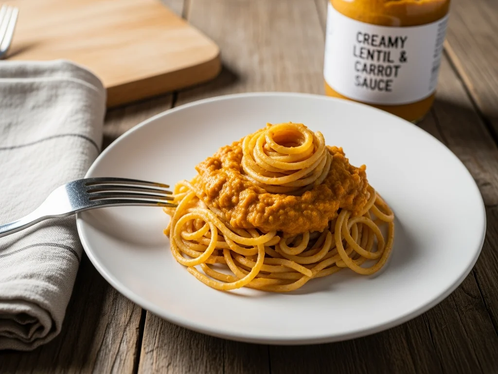Pełnoziarniste spaghetti w kremowym sosie z soczewicy i marchewki