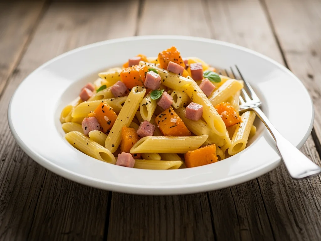 Penne z dynią i szynką