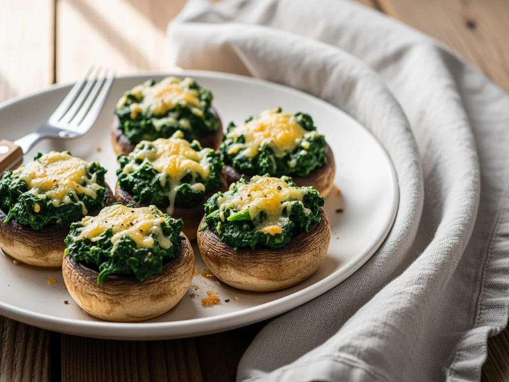 - Odłożone pieczarki napełnić szpinakowo-parmezanowym nadzieniem, następnie ułożyć w przygotowanym wcześniej naczyniu żaroodpornym. Piec 15-20 min (200°C). Pieczarki faszerowane szpinakiem i parmezanem podawać bezpośrednio po przygotowaniu.