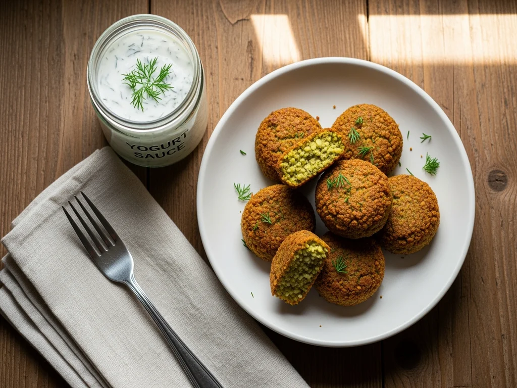 - Zwilżonymi wodą dłońmi uformować 18-20 kotletów (Ø 4 cm, grubość 1,5 cm), układać je na przygotowanej wcześniej blasze. Każdy falafel posmarować oliwą za pomocą pędzelka. Piec 8-10 min (200°C). Ostrożnie odwrócić na drugą stronę, piec kolejne 10 min (200°C) lub do momentu, aż falafele będą złotobrązowe. Pieczone falafele podawać jako samodzielną przekąskę z dodatkiem sosu jogurtowego z koperkiem lub z chlebkami pita i świeżymi warzywami.