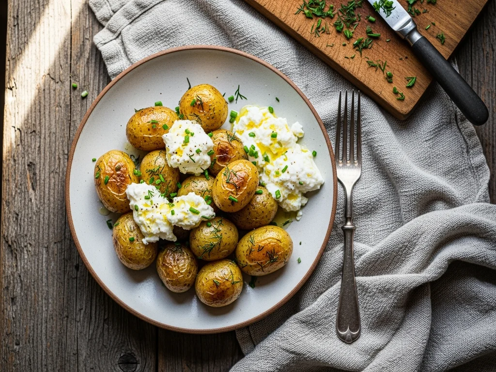 - Dodać twaróg, jogurt, sól i pieprz, wymieszać15 s//obr. 3. Pieczone młode ziemniaki podawać z twarożkiem, udekorowanym szczypiorkiem bezpośrednio po przygotowaniu.