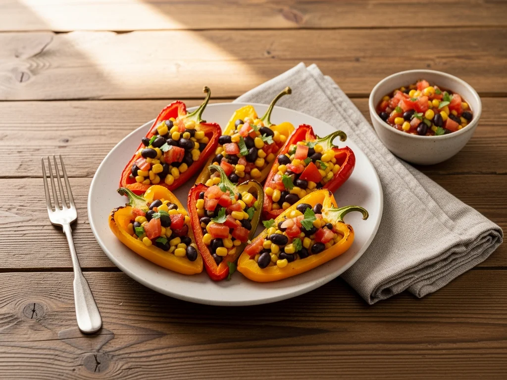4. Dodać mięso, fasolę, kukurydzę, koncentrat pomidorowy, sól i pieprz, przemieszać kopystką, gotować8 min/100°C//obr. . Nadzienie przełożyć do pieczonych papryk. Mozzarellę pokroić w 8 plastrów, na każdej papryce ułożyć 1 plaster. Piec kolejne 4-5 min (200°C), aż ser się rozpuści. Pieczone papryki po meksykańsku posypać zieloną cebulką ze szczypiorkiem i kolendrą i podawać bezpośrednio po przygotowaniu.