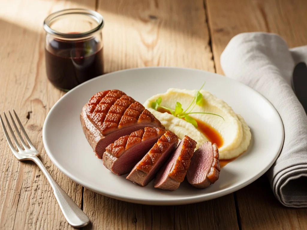 Pierś z kaczki z sosem z czerwonego wina, purée selerowo-kalafiorowe