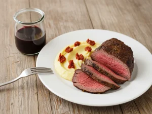 Pierś z kaczki z sosem z czerwonego wina, purée selerowo-kalafiorowe