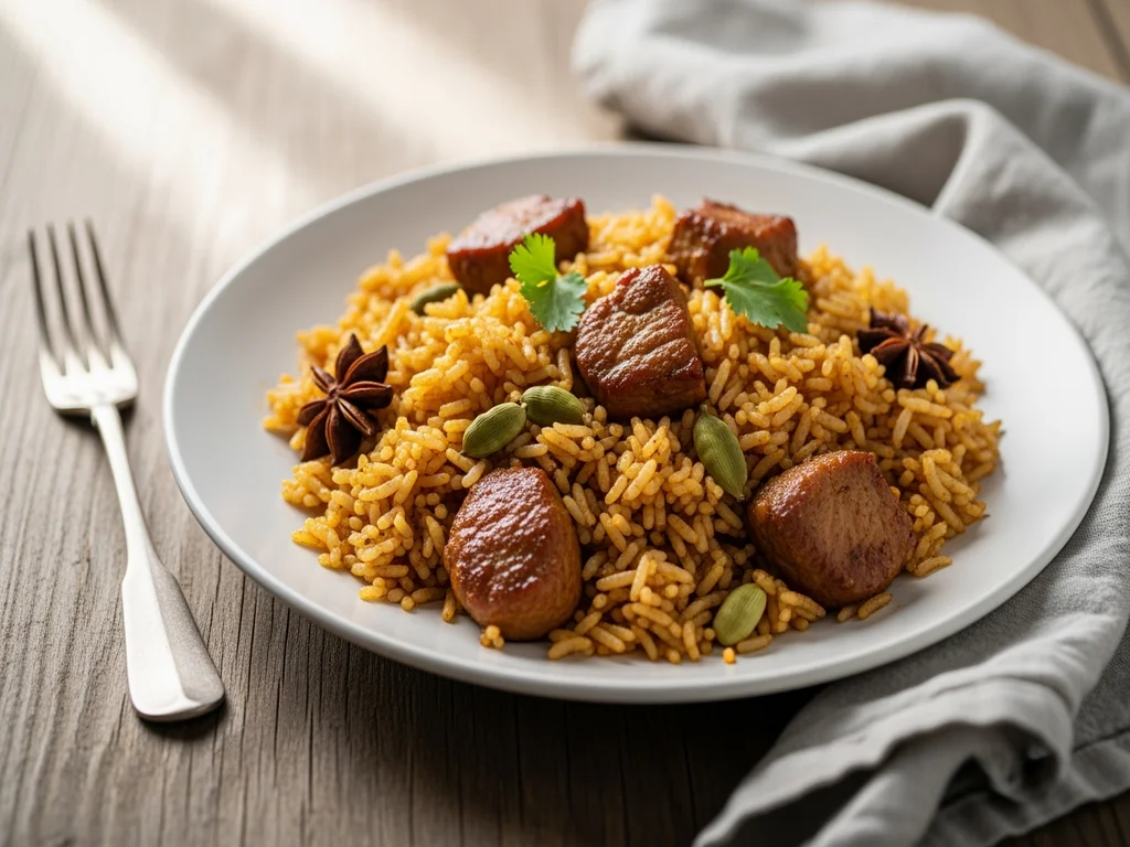 - Do naczynia miksującego dodać podgotowany ryż, dokładnie wymieszać kopystką, następnie pozostawić w zamkniętym naczyniu miksującym na 15-20 min. Pilaf z wieprzowiną podawać udekorowany natką pietruszki.