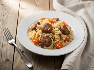 - Do naczynia miksującego dodać podgotowany ryż, dokładnie wymieszać kopystką, następnie pozostawić w zamkniętym naczyniu miksującym na 15-20 min. Pilaf z wieprzowiną podawać udekorowany natką pietruszki.