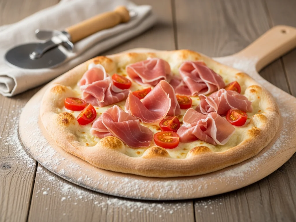 Pizza bianca z długodojrzewającą szynką i pomidorkami