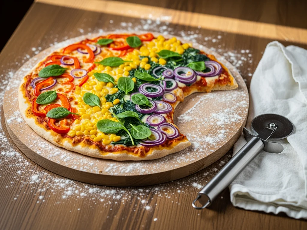 - Piec 20 min (220°C), jedna blacha po drugiej. Pizzę tęczę przekroić na pół i podawać bezpośrednio po przygotowaniu.