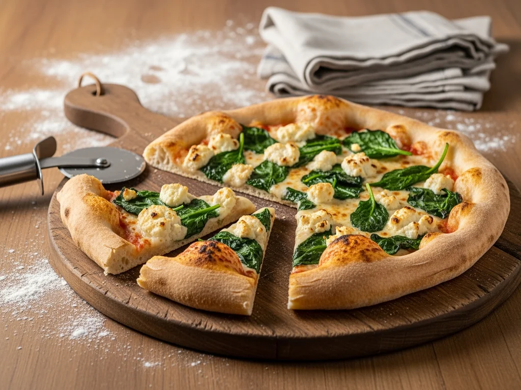 - Na wierzchu ciasta rozłożyć wcześniej przygotowany sos oraz masę ze szpinakiem, całość posypać rozdrobnionymi serami. Piec 8-12 min (250°C) na najniższej szynie piekarnika. Pizzę ze szpinakiem i owczym serem podawać bezpośrednio po przygotowaniu.