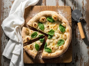 - Na wierzchu ciasta rozłożyć wcześniej przygotowany sos oraz masę ze szpinakiem, całość posypać rozdrobnionymi serami. Piec 8-12 min (250°C) na najniższej szynie piekarnika. Pizzę ze szpinakiem i owczym serem podawać bezpośrednio po przygotowaniu.