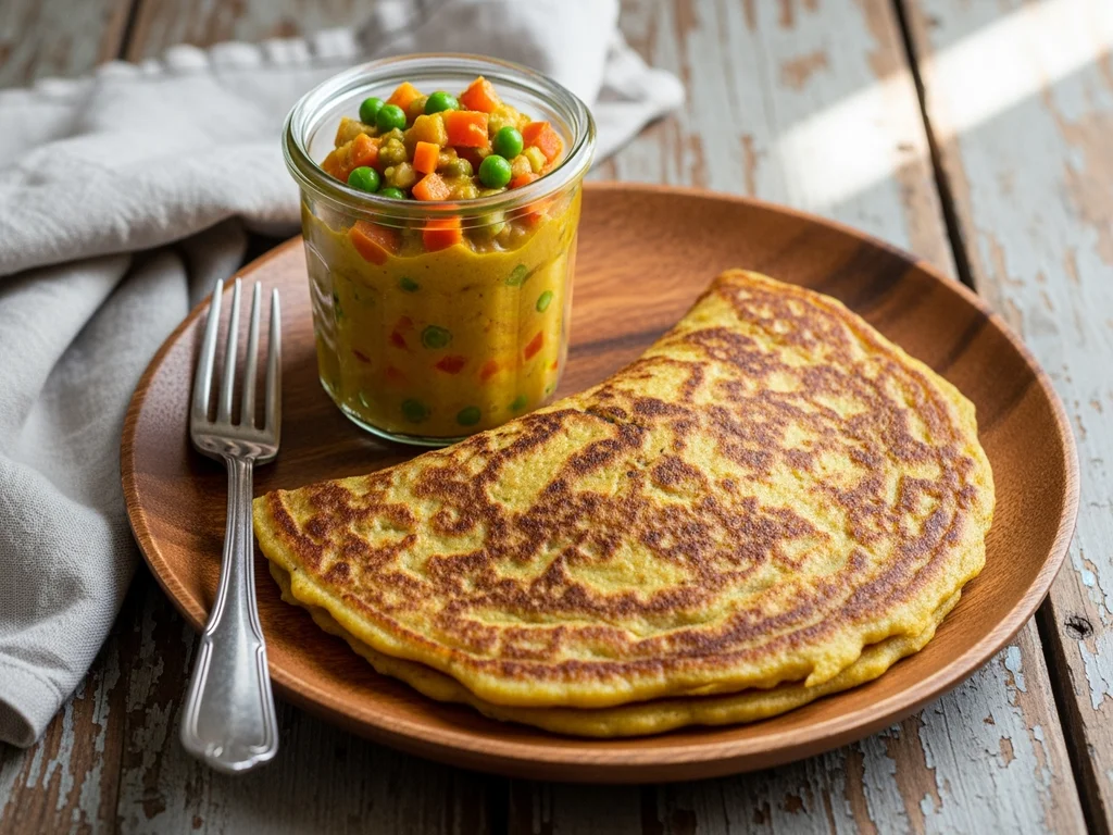 9. Placek z ciecierzycy z warzywnym dipem curry podawać udekorowany świeżą kolendrą.