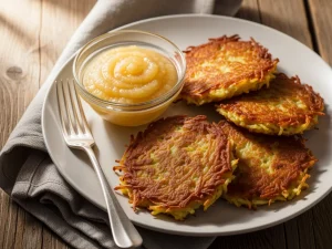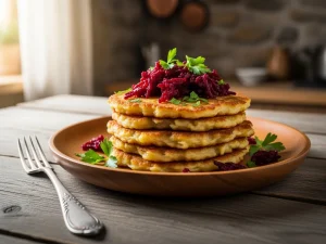 3. Na rozgrzaną patelnię wlać olej do smażenia, pokrywając dno cienką warstwą. Na gorący olej nałożyć 2 czubate łyżki masy, jedna na drugą, spłaszczyć za pomocą łyżki, formując placek (Ø 8-10 cm). Placki smażyć z obu stron, do momentu aż będą złotobrązowe i chrupiące, następnie odsączyć z nadmiaru tłuszczu na ręczniku papierowym. Placki ziemniaczane podawać bezpośrednio po przygotowaniu.