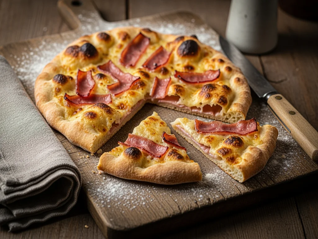 - Na oprószonym mąką papierze do pieczenia rozwałkować schłodzone ciasto na kształt prostokąta (ok. 40 x 30 cm). Na ciasto przełożyć zawartość naczynia miksującego, równomiernie rozprowadzić za pomocą kopystki. Piec 15-20 min (250°C) lub do momentu, aż podpłomyk nabierze złotobrązowego koloru. Podpłomyk z szynką (Flammkuchen) pokroić na kawałki i podawać udekorowany szczypiorkiem.