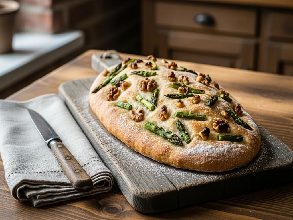 - Dodać serek kremowy, gałkę muszkatołową, sól i pieprz, wymieszać10 s/obr. 3. Przełożyć na rozwałkowane ciasto, równomiernie rozsmarować. Na całej powierzchni ciasta ułożyć odważone szparagi, ser feta i orzechy. Posypać cukrem. Piec 20 min (250°C) lub do momentu, aż podpłomyk będzie chrupiący. Podpłomyk ze szparagami i orzechami pokroić na kawałki i podawać na ciepło.
