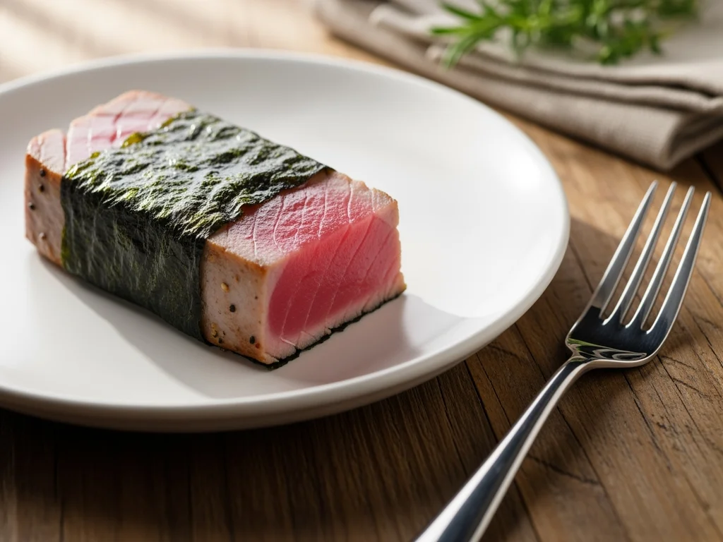 - Tuńczyka delikatnie przełożyć na deskę do krojenia, ostrożnie usunąć folię spożywczą. Tuńczyka szczelnie owinąć wodorostami nori, zwilżając brzegi wodorostów wodą, aby się skleiły. Owiniętego tuńczyka kroić w plastry o grubości ok. 1 cm, układać na ugotowanym porze. Tuńczyka w nori posypać sezamem, udekorować pozostałym awokado i plastrami rzodkiewki. Polędwicę z tuńczyka w nori podawać bezpośrednio po przygotowaniu z majonezem wasabi.