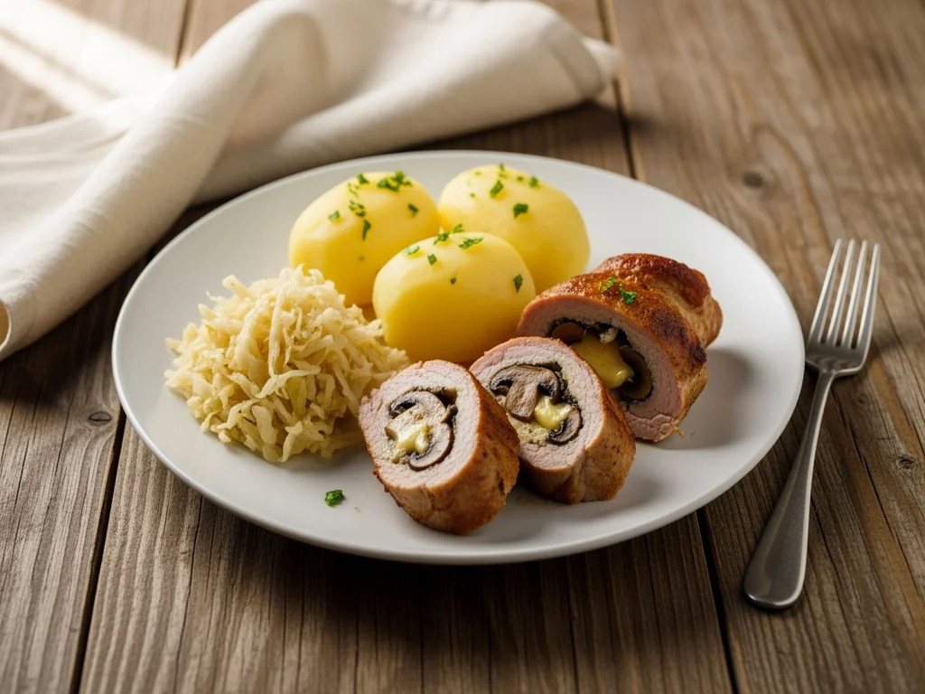Polędwiczki wieprzowe faszerowane pieczarkami i serem z ziemniakami; Kapusta gotowana
