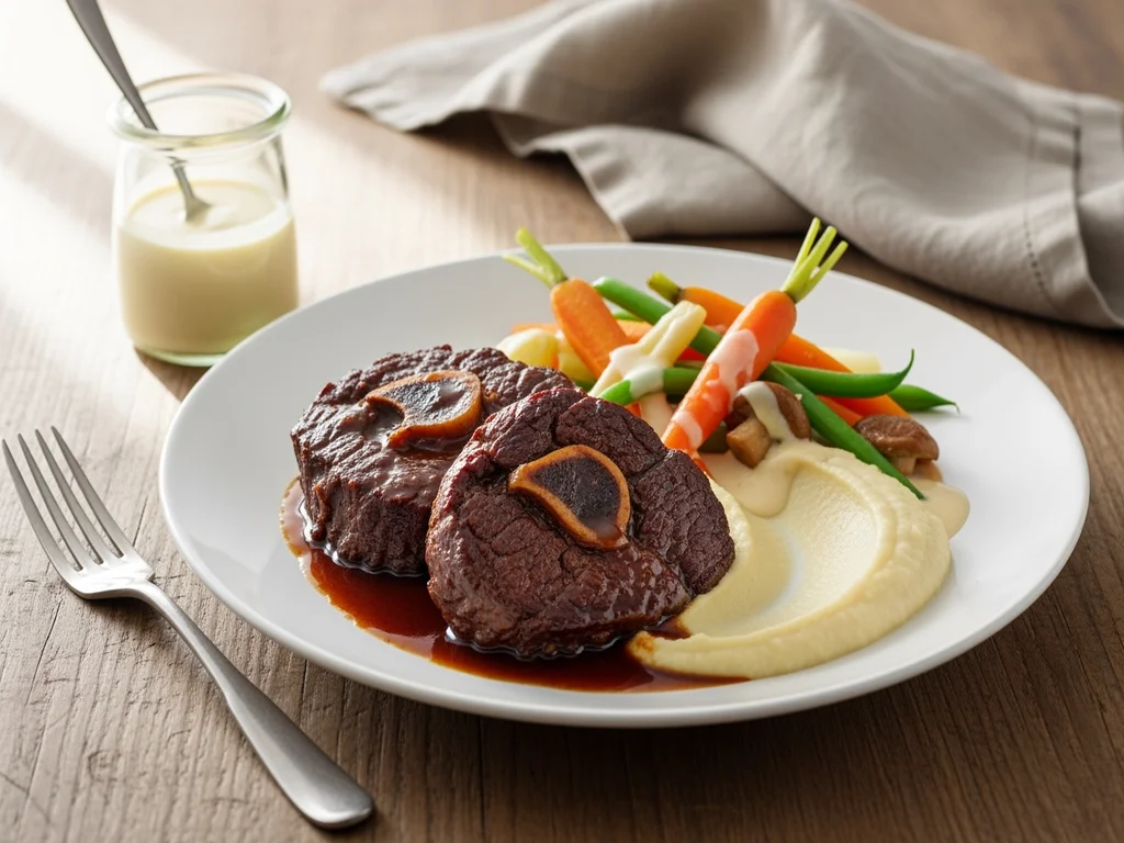 Policzki wołowe z purée z selera i warzywami w kremowym sosie