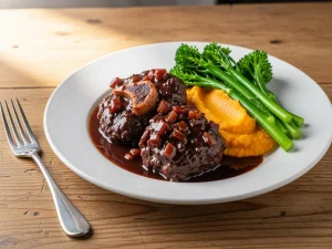 Policzki wołowe z purée z selera i warzywami w kremowym sosie
