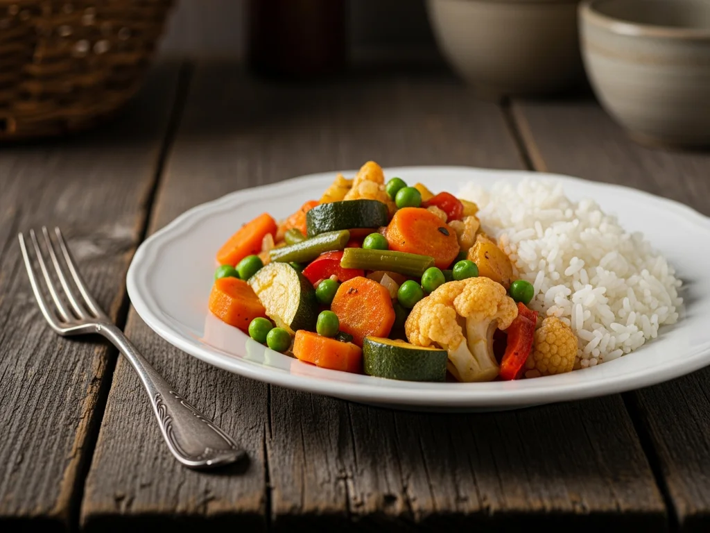- Dodać ryż, koncentrat bulionu warzywnego, paprykę, sól, kurkumę i wodę. Na pokrywę naczynia miksującego nałożyć przystawkę Varoma, odważyć do niej ciecierzycę, gotować na parze15-20 min/Varoma//obr. . Zdjąć przystawkę Varoma, ciecierzycę przełożyć do naczynia do serwowania potrawy. Dodać ryż z warzywami, delikatnie wymieszać kopystką i odstawić na 5 min. Potrawkę warzywną z ryżem podawać jako danie główne.