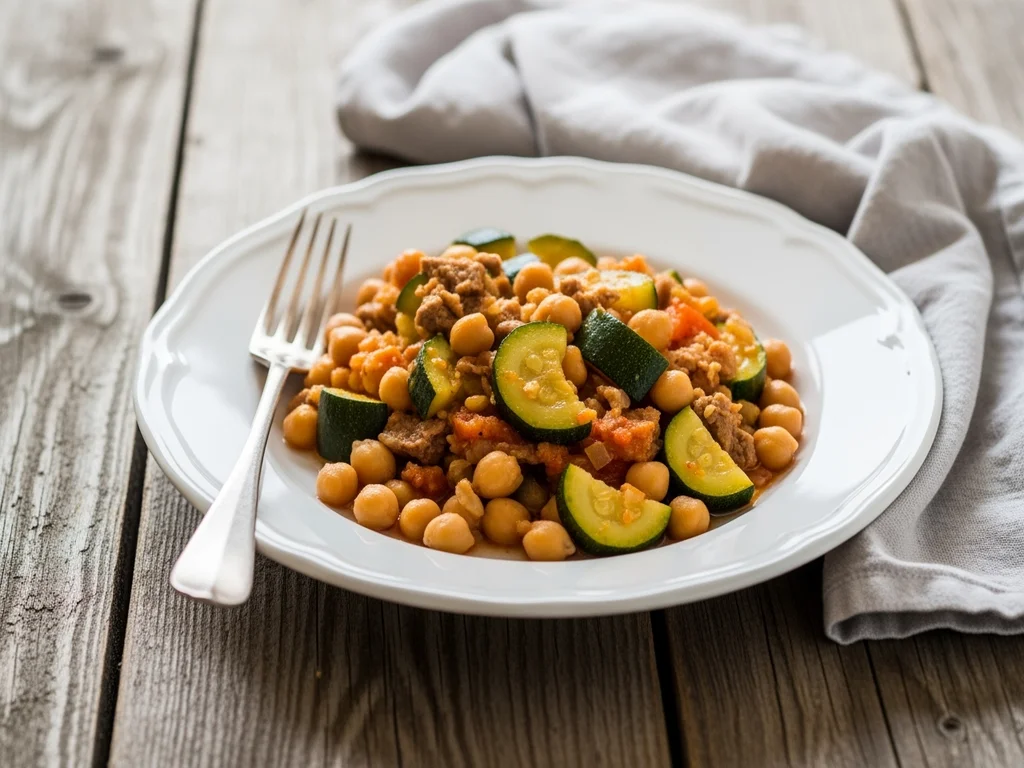 - Potrawkę z cukinii i ciecierzycy podawać bezpośrednio po przygotowaniu, udekorowaną listkami oregano.