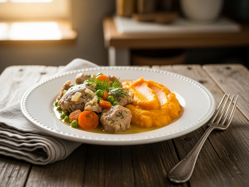 5. Do naczynia miksującego włożyć ugotowane na parze bataty, fasolę, 100 g sosu z potrawki z królika (bez warzyw) i kurkumę, zmiksować20 s/obr. 7. W razie potrzeby przemieszać kopystką, zmiksować kolejne10 s/obr. 7. Potrawkę z królika podawać z dodatkiem purée z batatów bezpośrednio po przygotowaniu.
