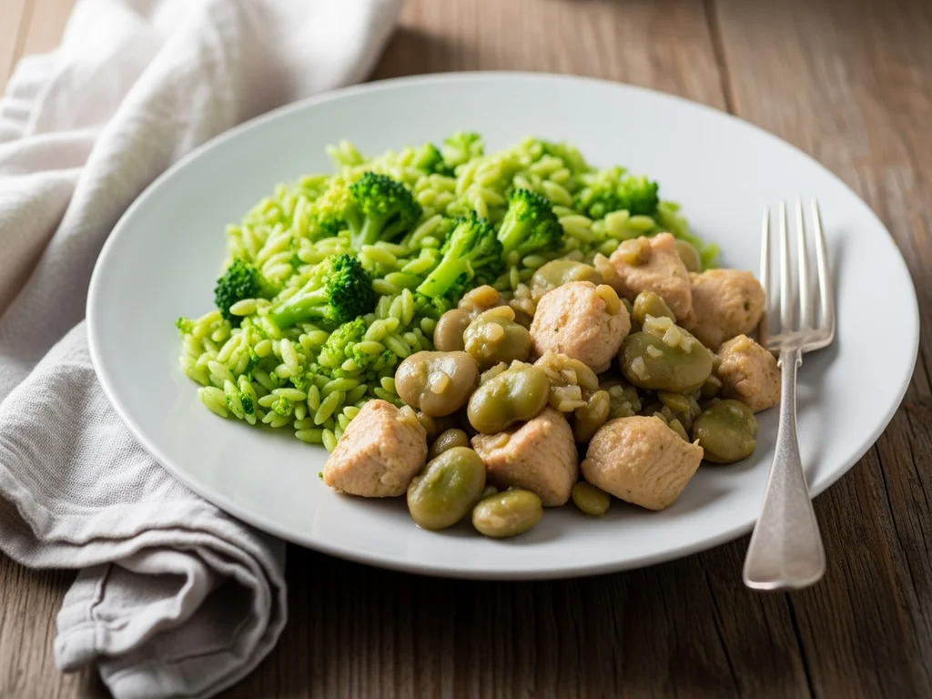 Potrawka z kurczaka i bobu z brokułowym makaronem orzo
