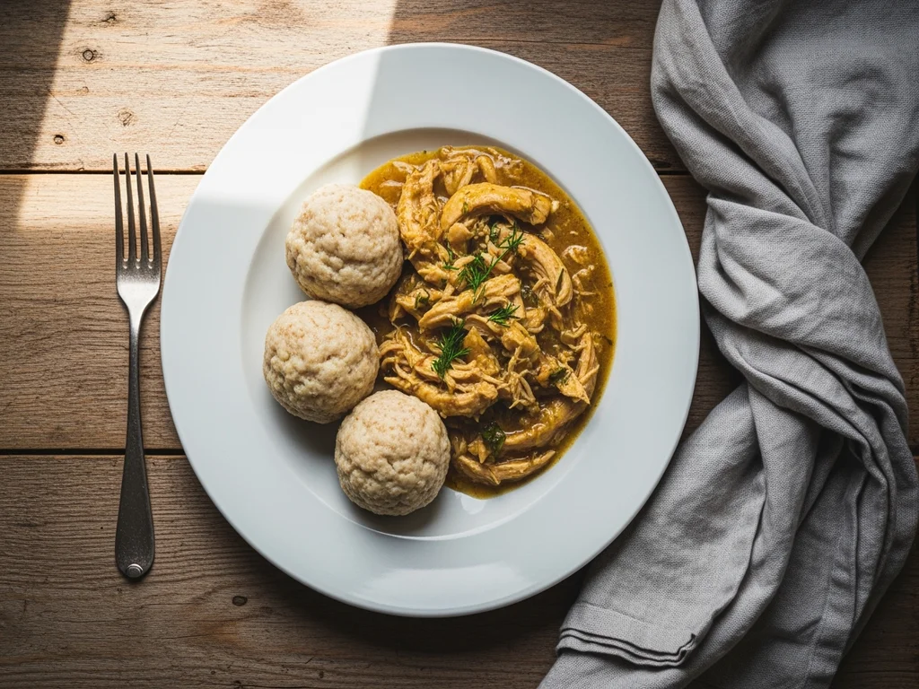 Potrawka z kurczaka z rosołu z pełnoziarnistymi kluskami na parze