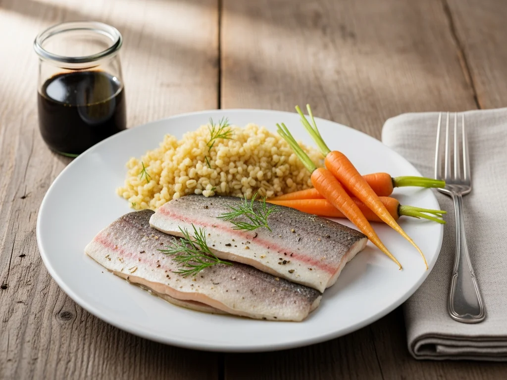 Pstrągi na parze z kaszą bulgur, młodą marchewką i sosem balsamicznym