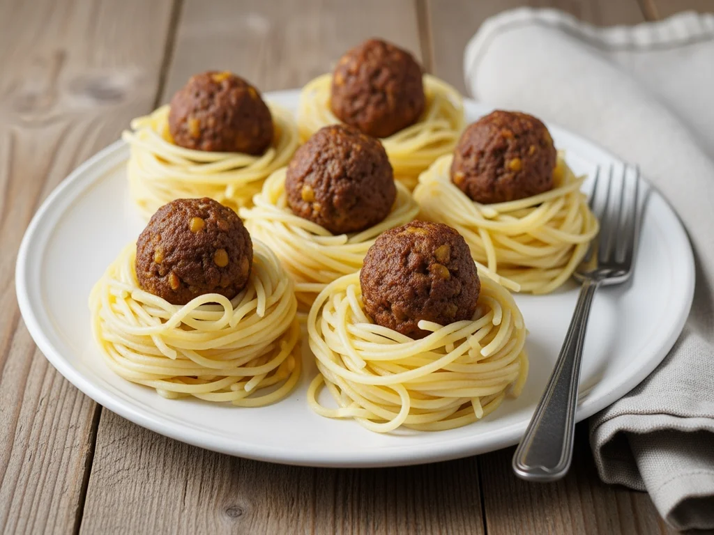 11. Śmietanę przełożyć do rękawa cukierniczego, odstawić. Na talerzu umieścić 2-3 łyżki sosu pomidorowego, ułożyć na nim 1 porcję ugotowanego makaronu, formując kształt gniazda. Na wierzchu ułożyć 2-3 pulpety z soczewicy. Pulpety udekorować trójkątami z papryki, tworząc dziób (patrz wskazówka). Na każdy pulpet nałożyć po dwie krople śmietany z rękawa cukierniczego, tworząc oczy. Na wierzchu każdego oka przykleić kawałek oliwki. Czynności powtórzyć z pozostałym sosem, makaronem i pulpetami z soczewicy. Danie udekorować natką pietruszki. Pulpety z soczewicy na gniazdach spaghetti podawać bezpośrednio po przygotowaniu jako danie główne (patrz wskazówka).