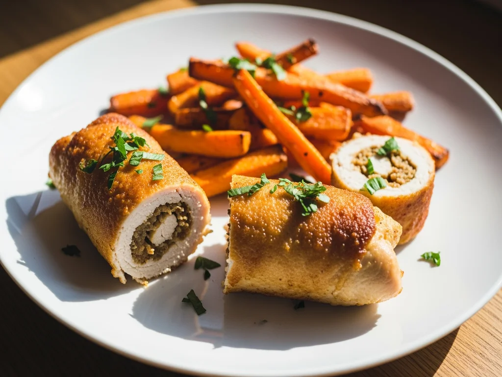 Roladka z kurczaka i frytki z marchewki