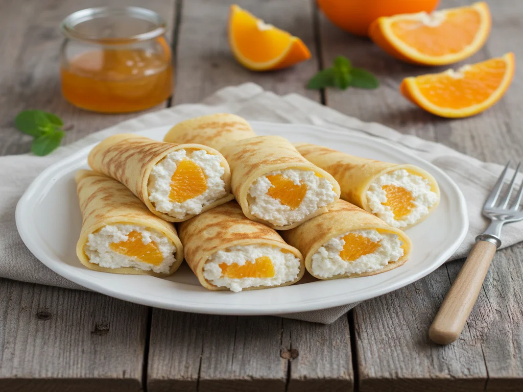 - Na suchą, nieprzywierającą patelnię, wsypać odważony wcześniej cukier, dodać odważony sok pomarańczowy, szybko wymieszać, następnie podgrzewać 3-4 min bez mieszania do momentu, aż zawartość patelni będzie mieć konsystencję złotobrązowego karmelu. Roladki naleśnikowe z ricottą i pomarańczą podawać bezpośrednio po przygotowaniu udekorowane kawałkami pomarańczowego karmelu.