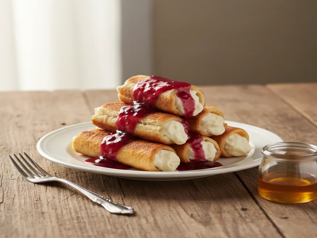 - Na kuchence, na patelni rozgrzać masło klarowane. W głębokim talerzu roztrzepać jajka z mlekiem. Roladki tostowe zanurzać w masie jajecznej, następnie smażyć na niewielkiej mocy palnika ze wszystkich stron, do uzyskania złotobrązowego koloru. Usmażone roladki od razu obtaczać w cukrze z cynamonem. Roladki tostowe podawać z sosem owocowym bezpośrednio po przygotowaniu lub zapakować w formie lunchboxu.