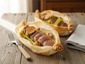 Ryba w papilotach ze świeżym kokosem, quinoa i porem
