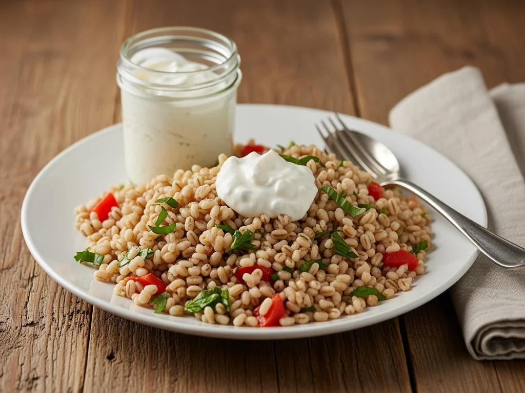 Sałatka z kaszą jęczmienną i dressingiem jogurtowym
