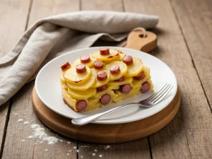 - Odważyć do naczynia żaroodporonego pozostałe 250 g ziemniaków, ułożyć jako ostatnią warstwę. Piec bez przykrycia 50 min (180°C) lub do momentu, aż ziemniaki na wierzchu będą lekko podpieczone.